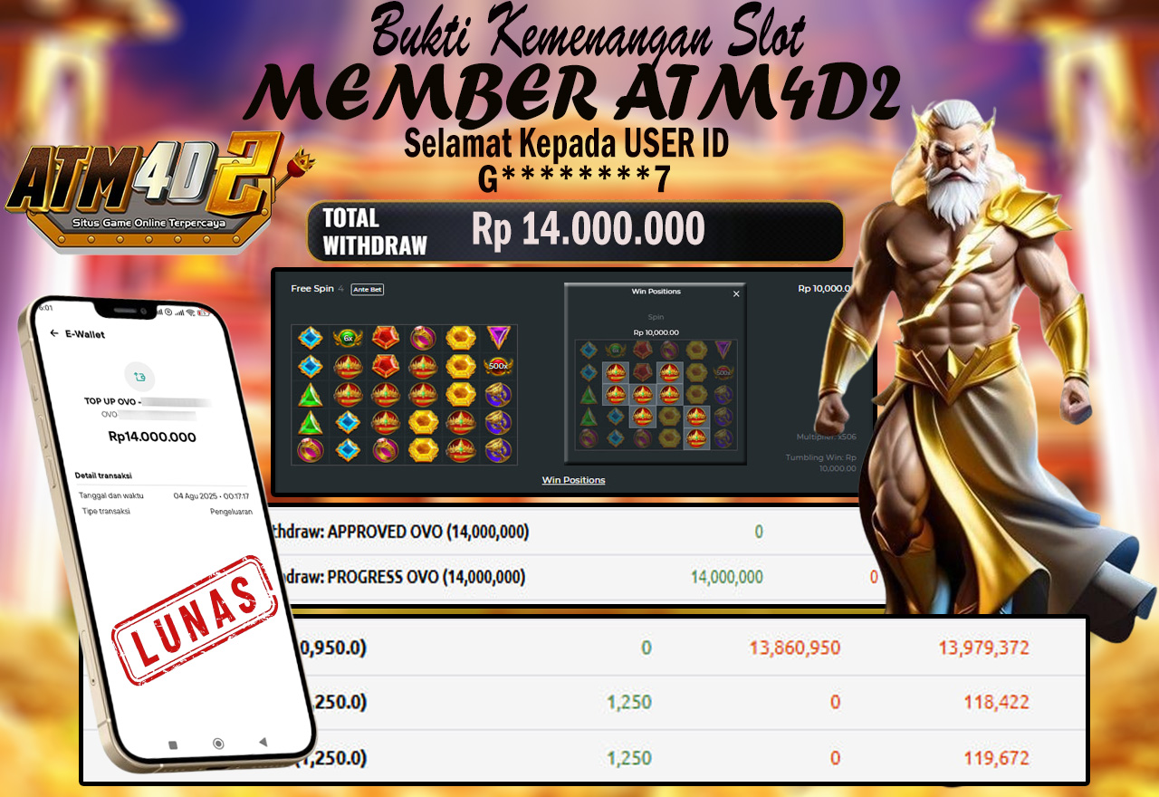 ATM4D2 dikenal sebagai situs terpercaya yang selalu menghadirkan pengalaman bermain slot online yang aman, fair, dan berlisensi resmi. Di sini, kami tidak hanya sekadar memberikan janji, tapi bukti nyata berupa slip kemenangan yang dapat Anda lihat secara langsung.