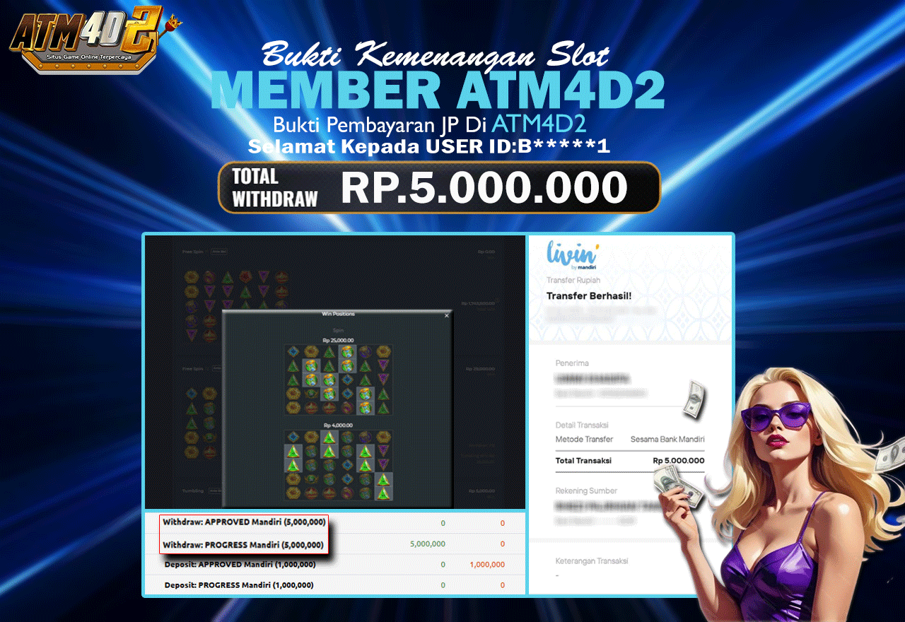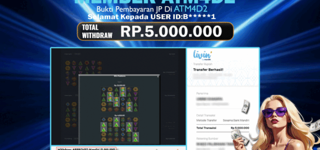 ATM4D2 dikenal sebagai situs terpercaya yang selalu menghadirkan pengalaman bermain slot online yang aman, fair, dan berlisensi resmi. Di sini, kami tidak hanya sekadar memberikan janji, tapi bukti nyata berupa slip kemenangan yang dapat Anda lihat secara langsung.