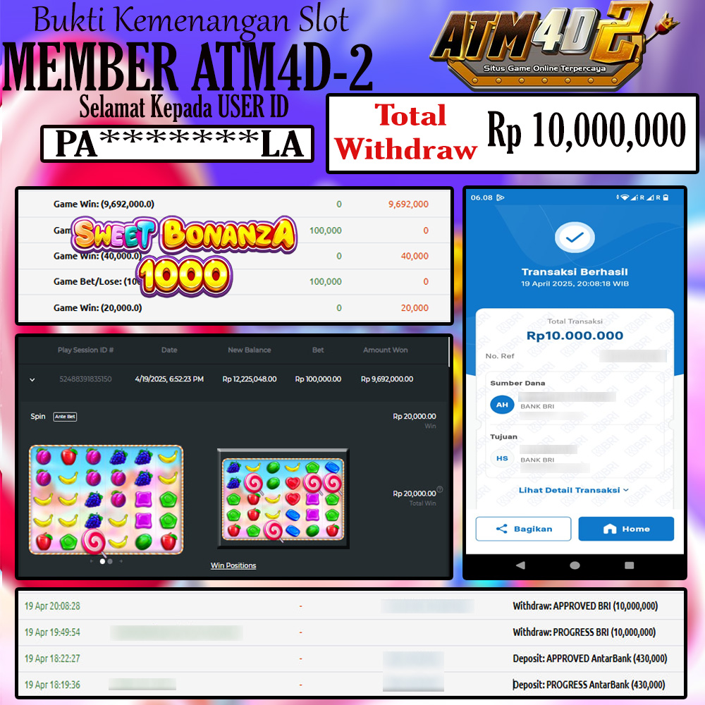 ATM4D2 dikenal sebagai situs terpercaya yang selalu menghadirkan pengalaman bermain slot online yang aman, fair, dan berlisensi resmi. Di sini, kami tidak hanya sekadar memberikan janji, tapi bukti nyata berupa slip kemenangan yang dapat Anda lihat secara langsung.