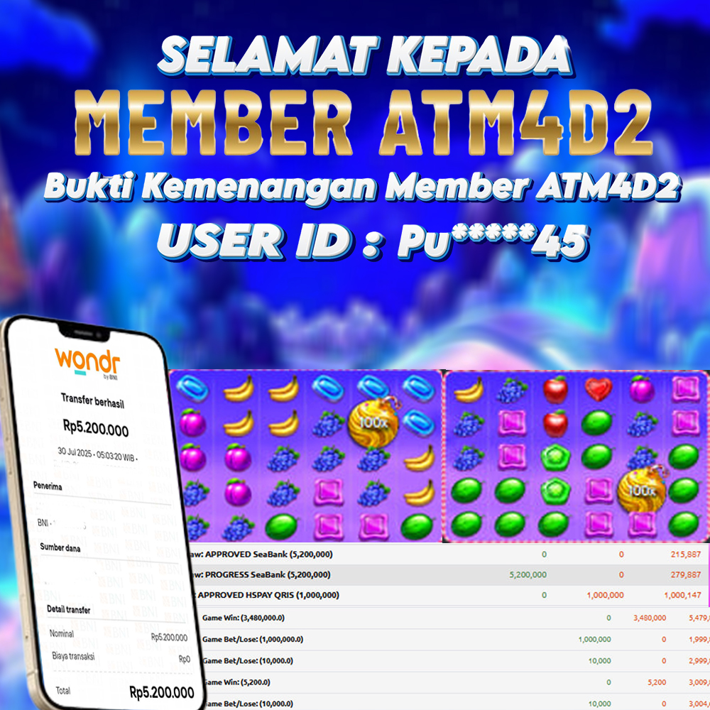 ATM4D2 dikenal sebagai situs terpercaya yang selalu menghadirkan pengalaman bermain slot online yang aman, fair, dan berlisensi resmi. Di sini, kami tidak hanya sekadar memberikan janji, tapi bukti nyata berupa slip kemenangan yang dapat Anda lihat secara langsung.